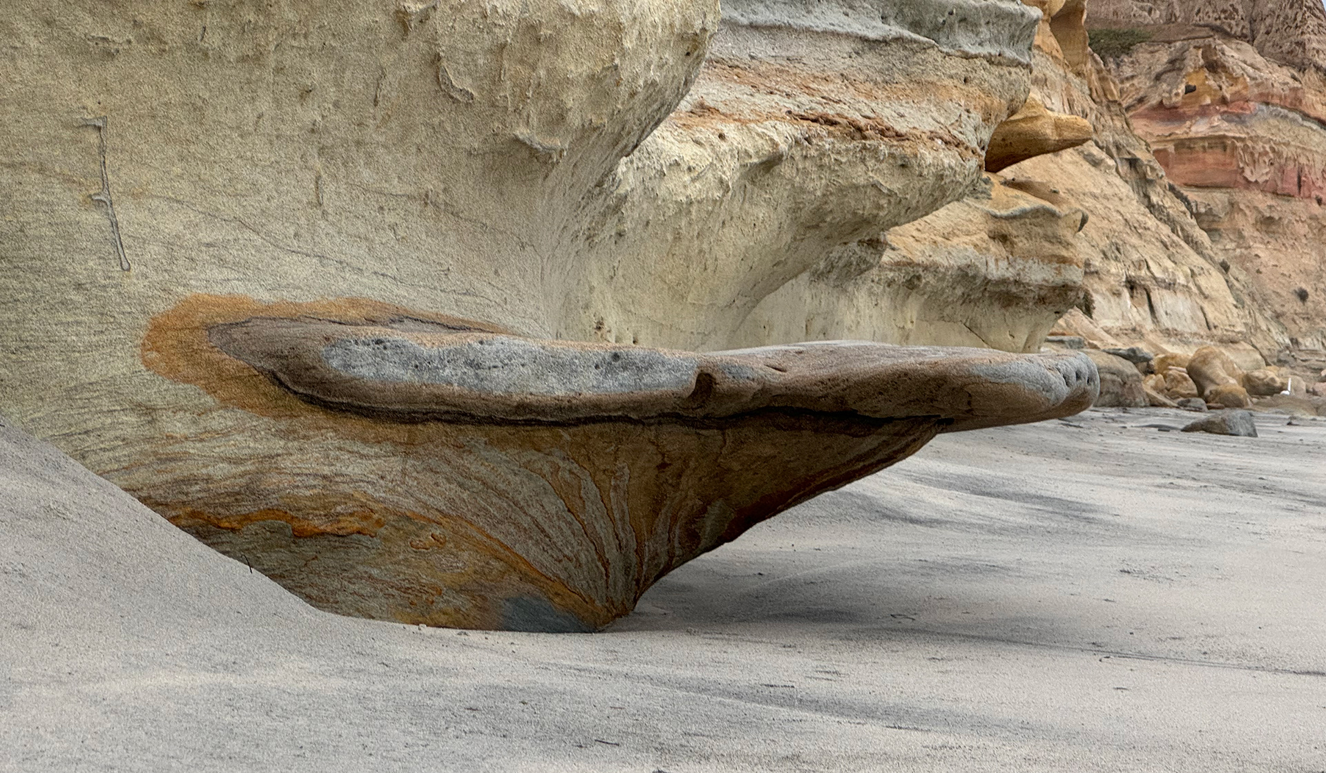 Torrey Pines State Reserve South Beach: "My Heart is this Big" Wall, colors are somewhat subdued on a early Sunday morning low tide walk